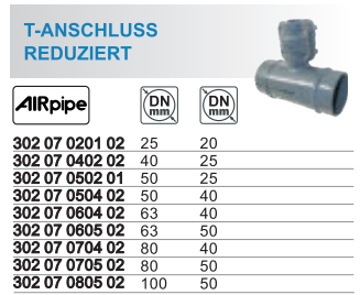 90° T-anschluss reduziert für Rohre AirPippe (von DN20 bis DN50)